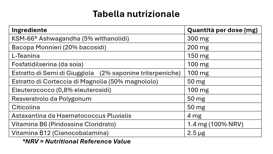 NEUROWIT contiene Bacopa (Bacopa monnieri) estratto di erba titolato al 20% in bacosidi, KSM-66® Ashwagandha estratto di radice titolato al 5% in withanolidi, Citicolina, L-Teanina, Eleuterococco (Eleutherococcus senticosus) estratto di radice titolato allo 0,8% in eleuterosidi, gluconato di zinco, nicotinamide (Niacina), cloridrato di tiamina (Vitamina B1), cloridrato di piridossina (Vitamina B6), riboflavina (Vitamina B2), L-Calcio Metilfolato (Acido Folico) e D-Biotina (Vitamina H).