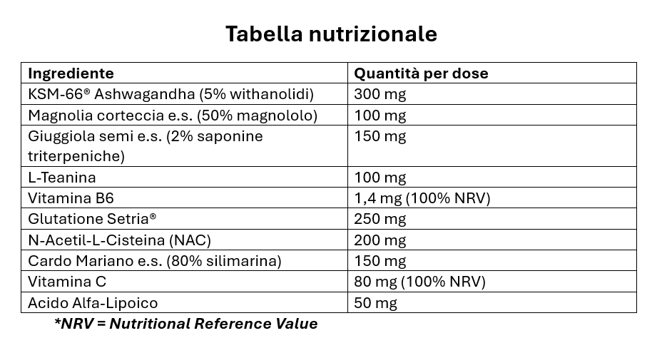 Dieses Paket kombiniert vier gezielte Produkte. Bio-Lifting und Eye Contour enthalten Acmella Oleracea-Extrakt (96,5 % natürlichen Ursprungs), der als "natürliches Botox" bekannt ist, sowie antioxidative und glättende Peptide. Ansiwit enthält 300 mg KSM-66® Ashwagandha (5% Withanolide), 100 mg Magnolienrindenextrakt (50% Magnolol), 150 mg Jujube-Samenextrakt (2% Triterpensaponine), L-Theanin, Vitamin B6 und ätherisches Lavendelöl, um Stress abzubauen und den Schlaf zu verbessern. Glutadetox enthält 250 mg Glutathion Setria®, 200 mg NAC, 150 mg Mariendistel-Extrakt (80% Silymarin), 80 mg Vitamin C, 50 mg Alpha-Liponsäure, 12 mg Vitamin E, Selen und Vitamin B2, um die Zellen zu entschlacken und zu reparieren.